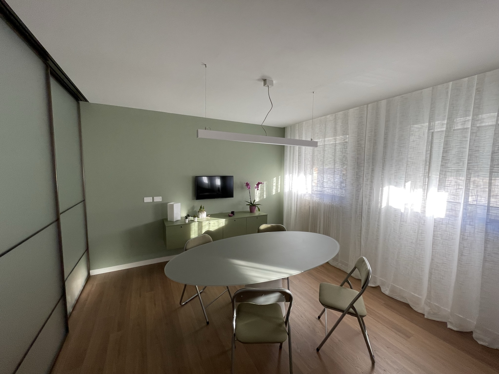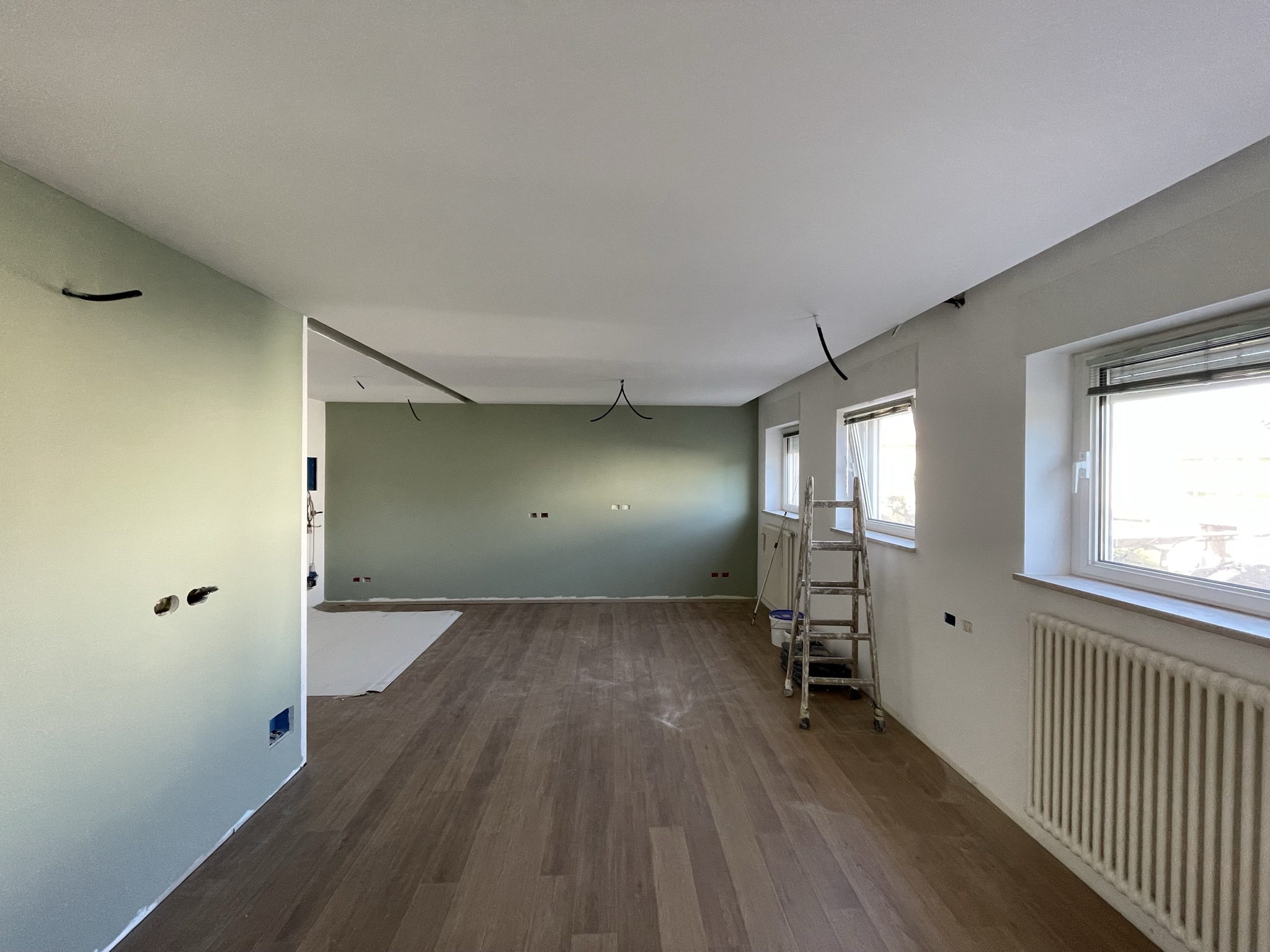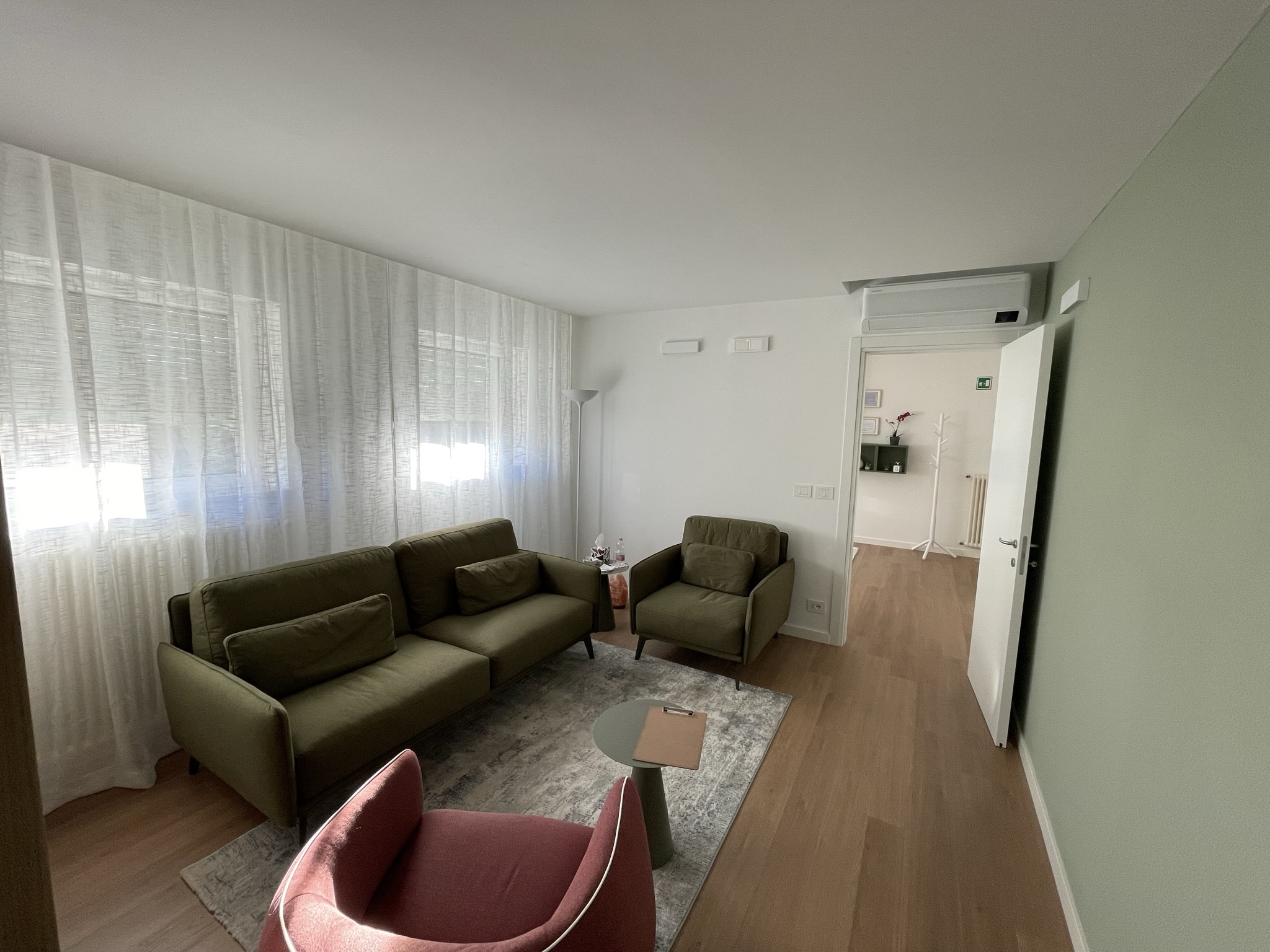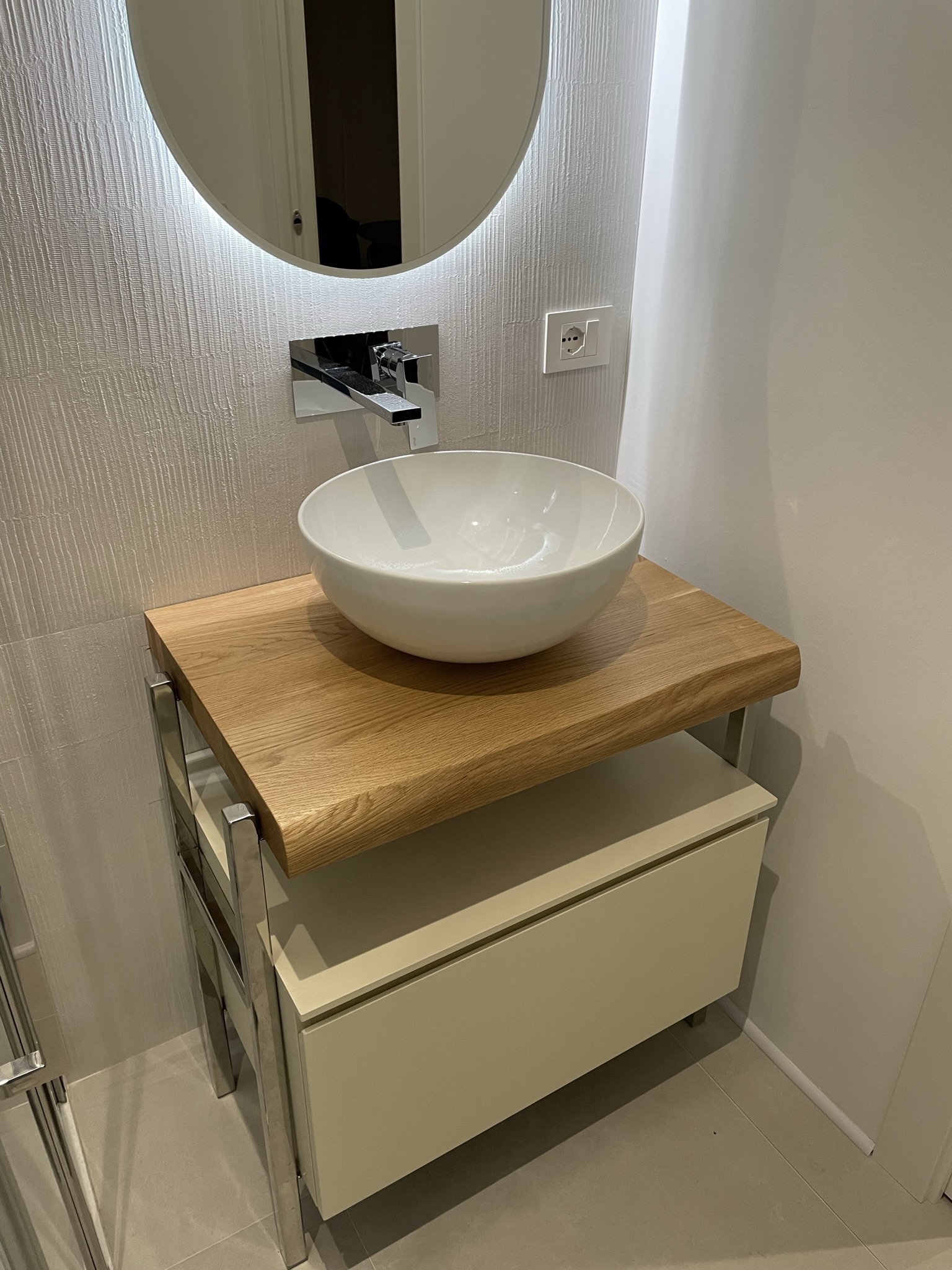 Piastrelle pavimento bagni Marazzi Stream white dimensione 60x60 cm, Piastrelle pareti bagni Marca Corona serie Incizo gesso dimensione 30x90 cm e Multiforme ramage freddo, dimensione 7,5x30 cm, Pavimento laminato Pergo serie Modern Plank dimensione 138x19 cm sp.9 mm con bisellatura 4V, Arredo bagno Punto Tre con top in legno massello rovere naturale e lavabo Astro 42 in ceramica. Rubinetteria Effepi serie H-Uno, Sanitari Althea serie Cover, Porte interne Pessot Porte serie Pordenone in laminato bianco.